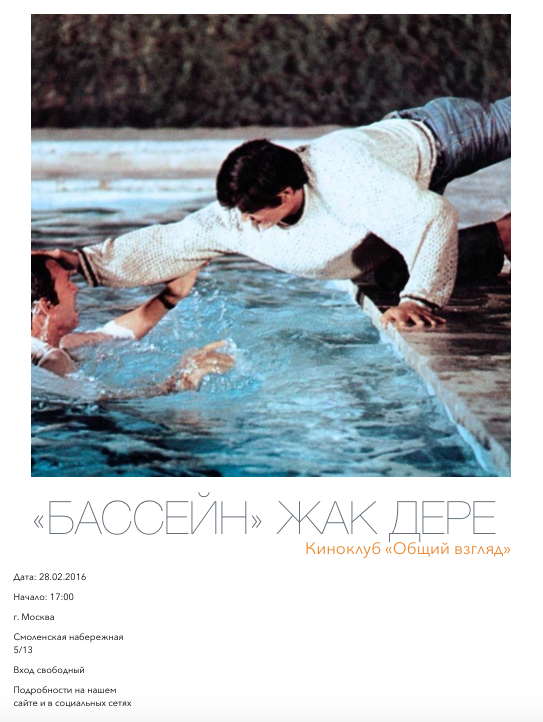 Следующий кинопоказ пройдет у нас в рамках знакомства с европейским кинематографом. Состоится показ в воскресенье 28 февраля в 17-00. Смотрим фильм – «Бассейн», режиссер Жак Дере, 1969 г., в главных ролях Роми Шнайдер и Ален Делон.