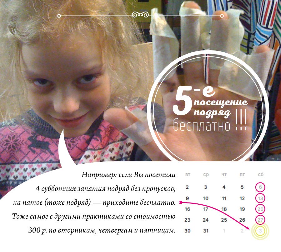 Те, кто посещает занятия 4 недели подряд, в один и тот же день, без пропусков, пятый раз подряд приходит бесплатно. Например: если Вы посетили 4 субботних занятия подряд без пропусков, на пятое (тоже подряд) — приходите бесплатно. Тоже самое с другими практиками со стоимостью 300 р. по вторникам, четвергам, пятницам. Участник должен сам сказать администратору на ресепшне, о том, что у него есть 4 посещения подряд, администратор проверяет эту информацию по журналу и пропускает на занятие бесплатно.